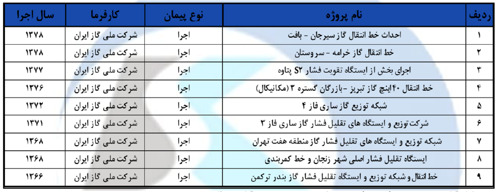پروژه های به اتمام رسیده در قالب شرکت خط لوله تهران پروژه هایی که از سال ۱۳۶۶ تا سال ۱۳۷۸ توسط هسته مرکزی شرکت در قالب شرکت خط لوله تهران به اتمام رسیده اند به شرح ذیل می باشد: